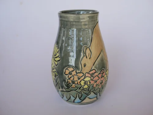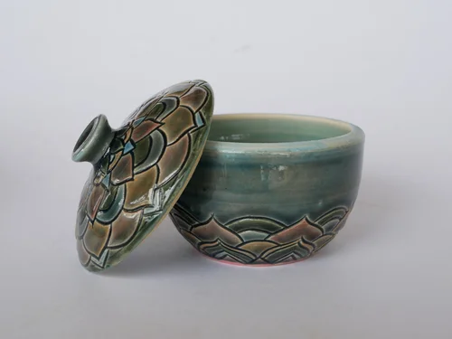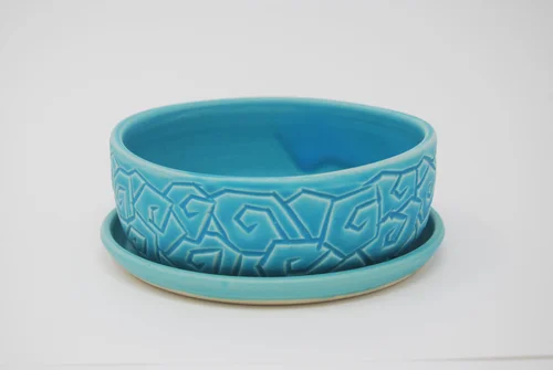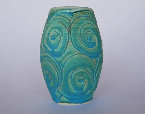 Handmade with porcelain and finished in a soda kiln creating colorful patterns and smoky details.