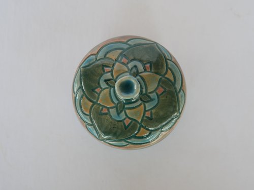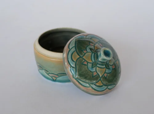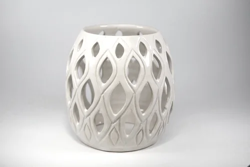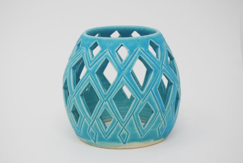 Hand-carved repetitive pattern. Leaf shaped cutouts with hand-carved details on the surface as well. Put a tealight inside to enjoy its function.